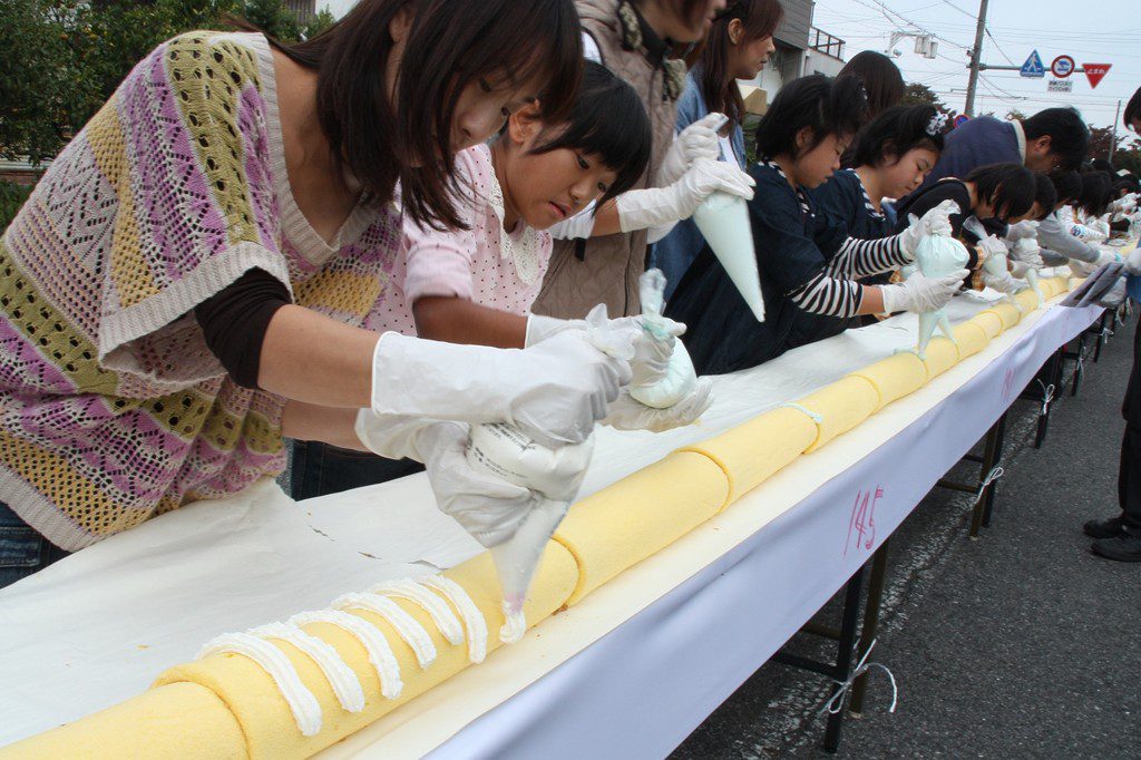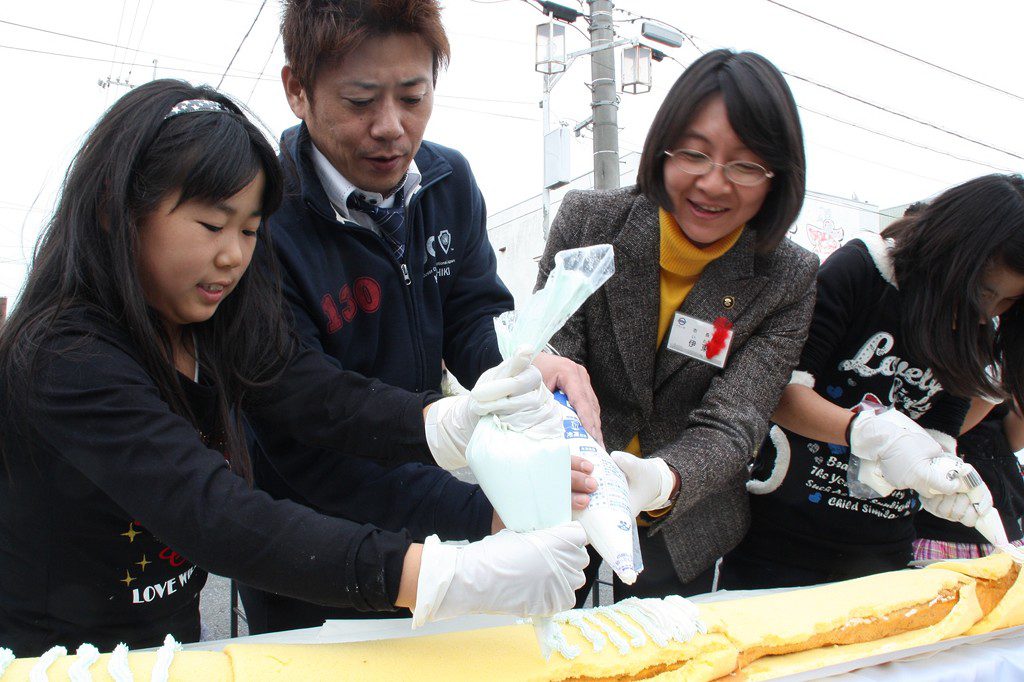 水島商店街にて行われた水島スイーツフェスタ2012では、水島の商店街を盛り上げようと、スイーツをテーマに多くのスイーツ店やステージでの音楽や踊りなどを催し、メインイベントとしてロールケーキの長さでギネスに挑戦しました。オープニングライブ後、駐車場に現れた巨大迷路は子供たちに大人気。長蛇の列ができていました。商店街では大学生ボランティアの皆さんや地元スイーツ店の方々が出店しており、商店街に甘い香りが漂っていました。そして、メインであるロールケーキでのギネス挑戦には大勢の方にご参加頂き、見事に130mを超える長さのロールケーキが完成しました。
