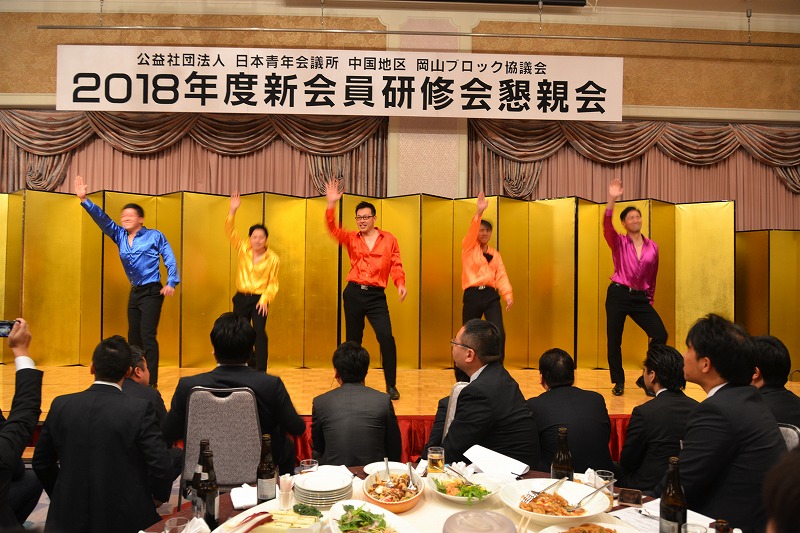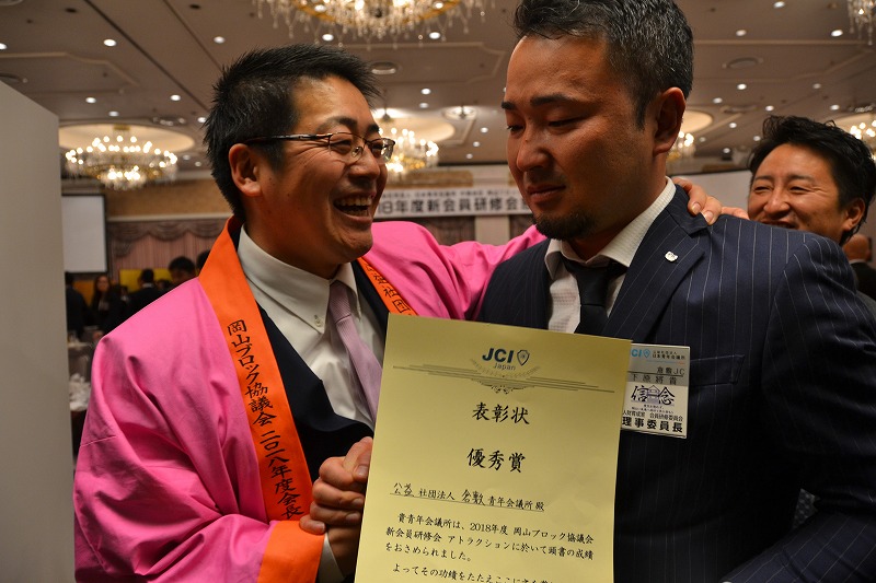 その後の懇親会では、2017年度後期に入会したメンバーと2018年度前期入会の新会員とで、約1ヶ月半の間に構成から練習まで新会員のみで考え、連日連夜練習に取り組んできたアトラクションの発表の場がありました。本年度のアトラクションは順位がつくという事もあり新会員の演技が燃え上がるのは当然ながら、メンバーの応援にも熱が入りました。例年に劣る事のない迫力ある演技で会場全体を魅了し、倉敷から応援に駆け付けた多くのメンバーも感動する素晴らしい内容でした。順位は優秀賞という事で2位と言う結果でしたがこれまでの苦労と終わった後の素敵な涙と笑顔は、アトラクションメンバーのこれからの長いJC生活での礎になると思います。