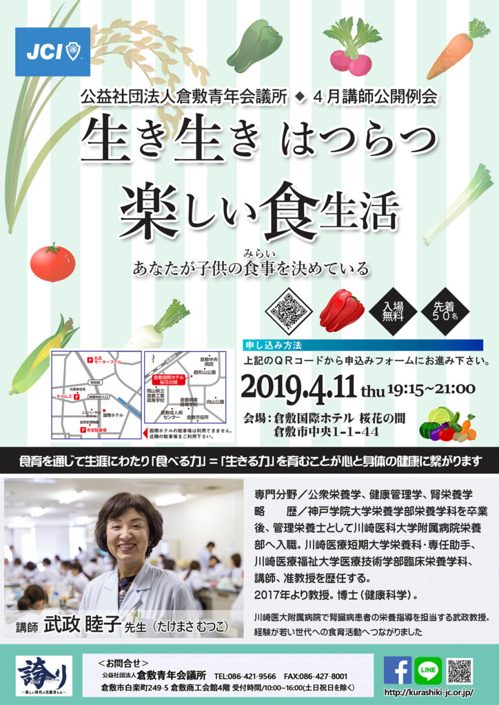 4月講師公開例会「生き生き はつらつ 楽しい食生活」開催のお知らせ